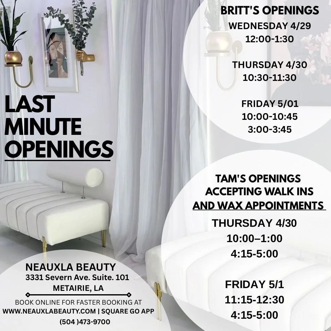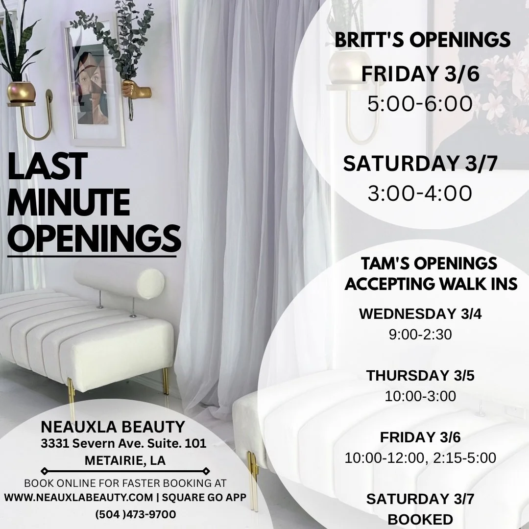 Appointments must be managed through our square online booking system. You may also call or text 504-473-9700 as a courtesy, but please note that our front desk may be unavailable while assisting other clients or during closed hours. Clients are ultimately responsible for managing appointments online when front desk isn’t available.